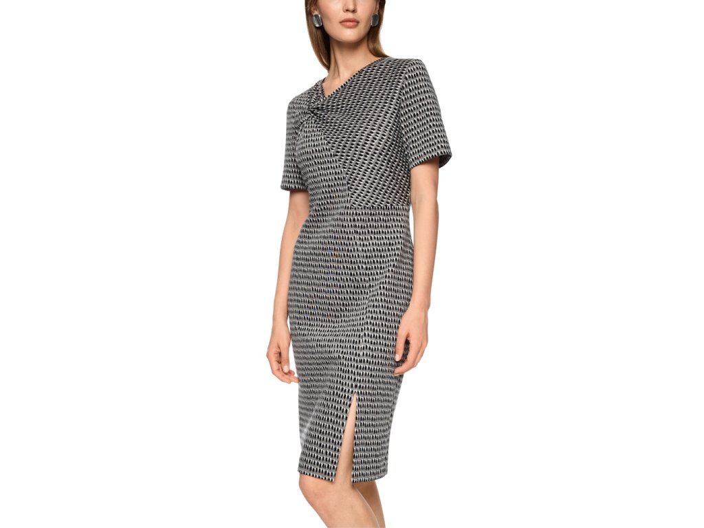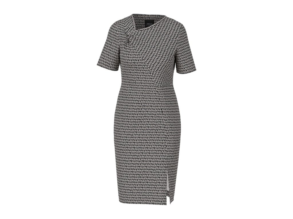 Asymetrické šaty z měkkého elastanu pro dokonalé pohodlí – se sofistikovaným výstřihem, bočním rozparkem a krátkými rukávy.