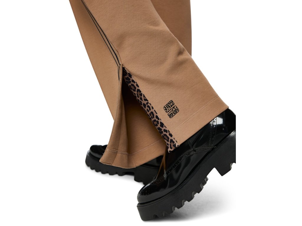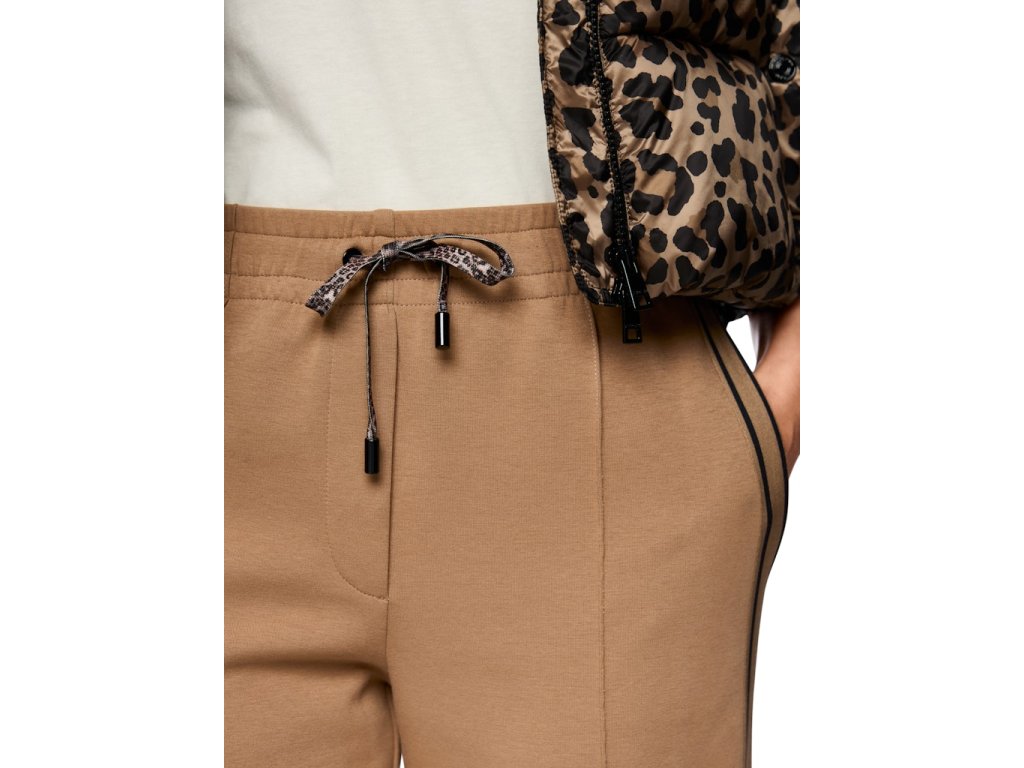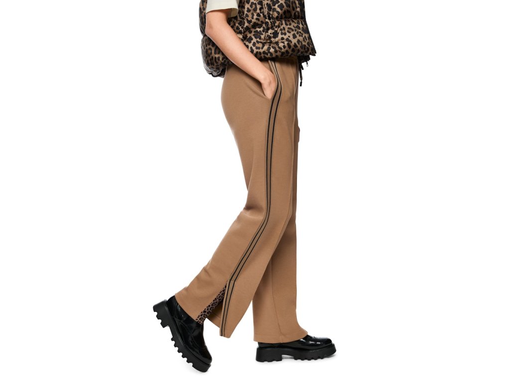 Výrazným detailem je boční pruh, který opticky prodlužuje nohavici a končí rozparkem na lemu.