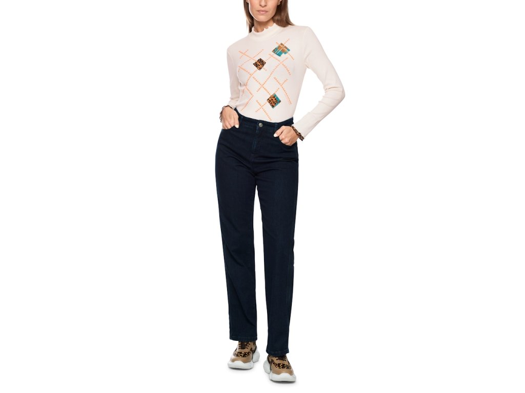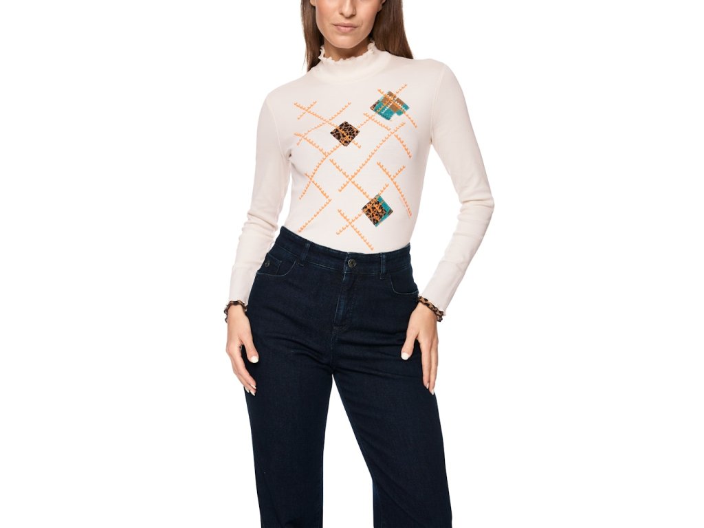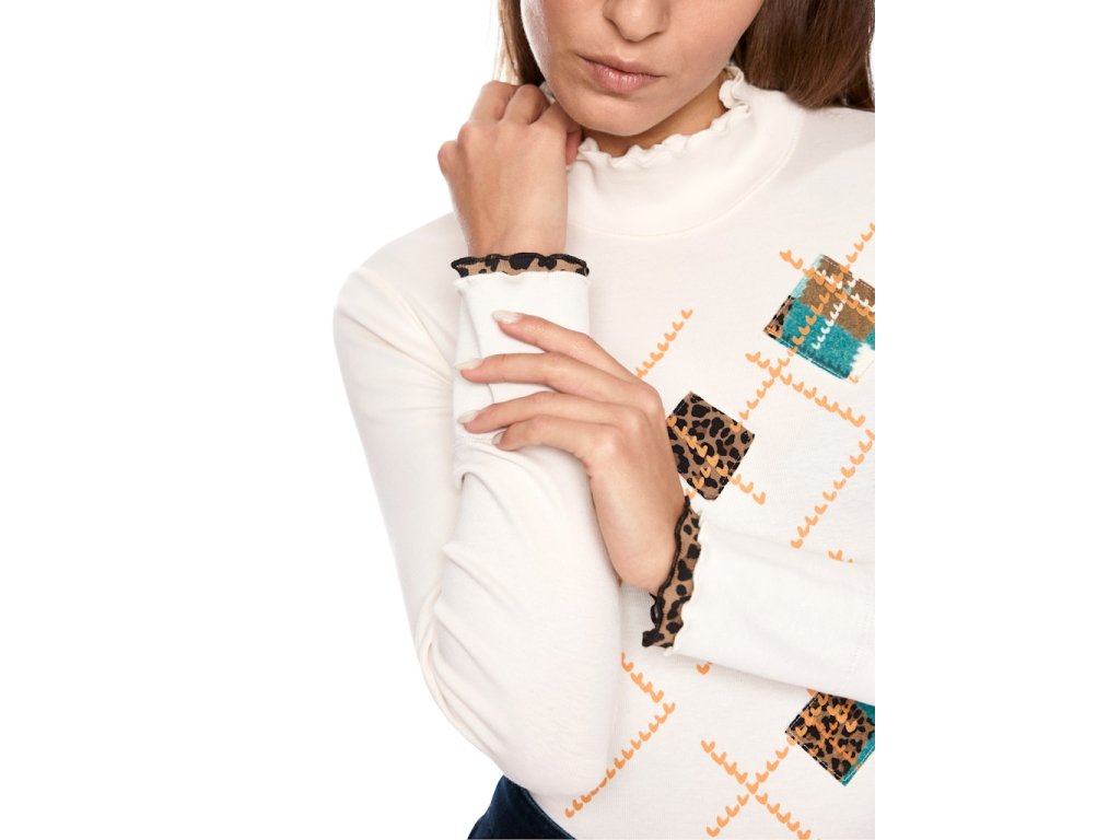 Přední část zdobí vzor, rukávy mají olemování a leopardí potisk pro stylové akcenty.